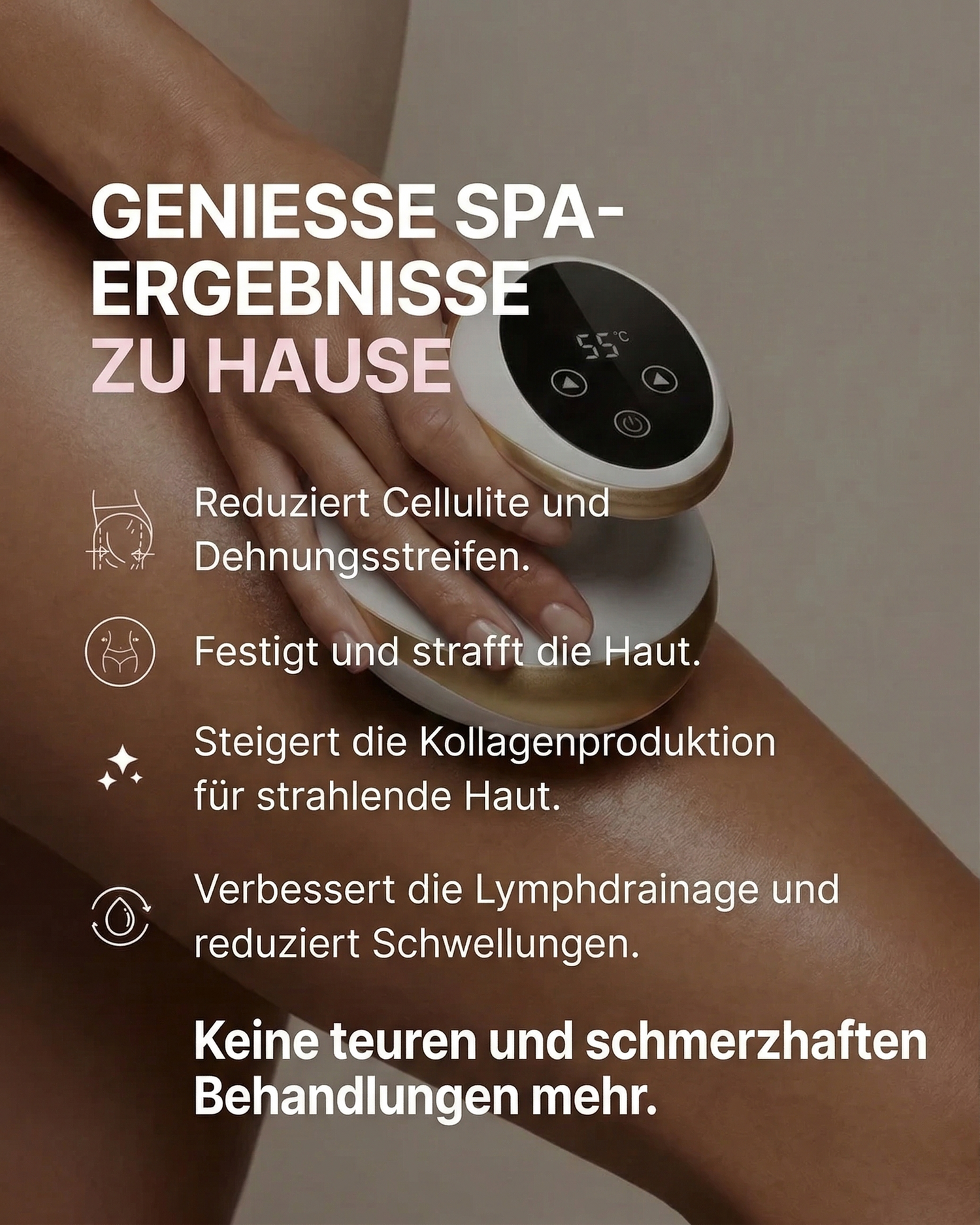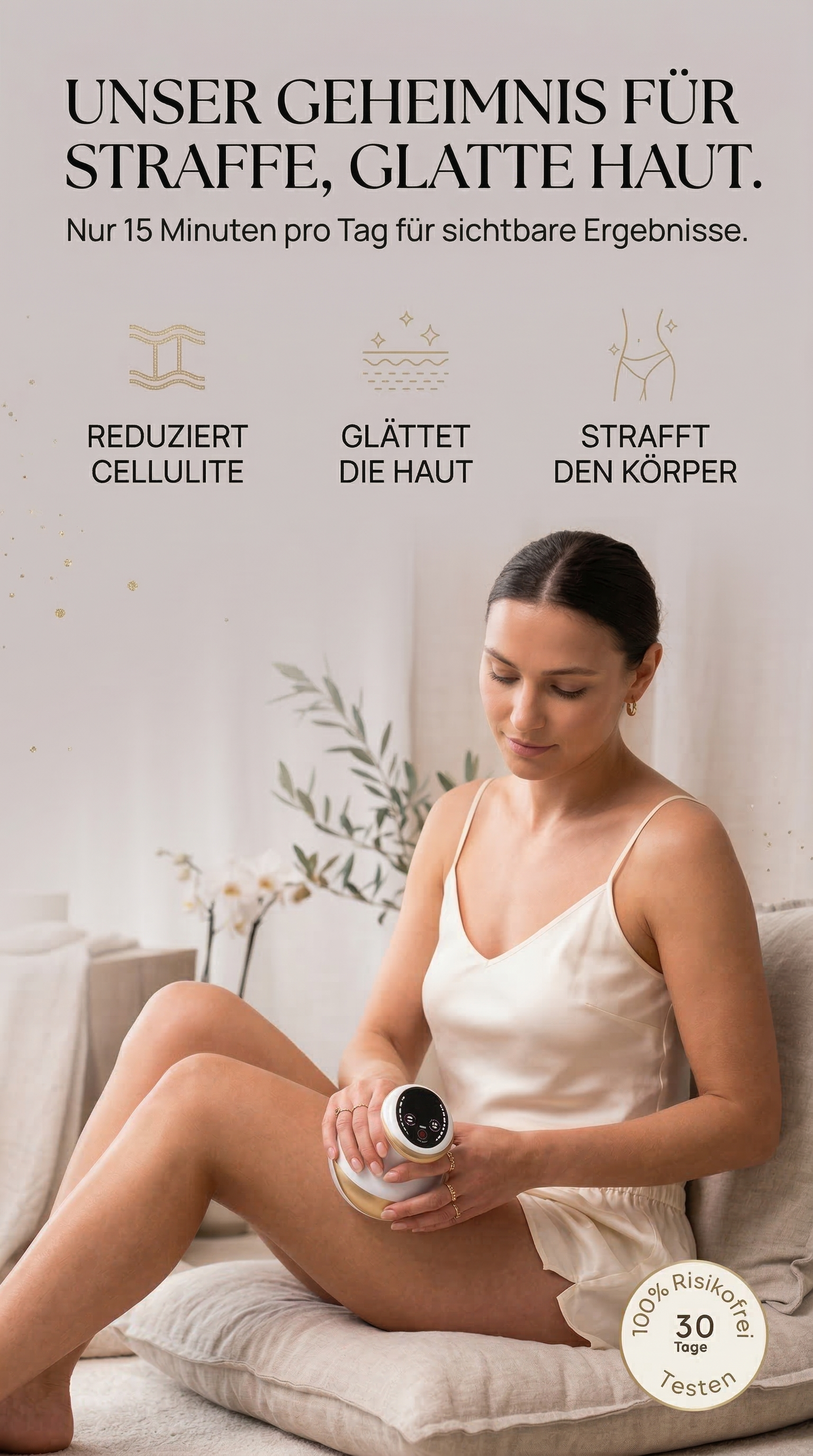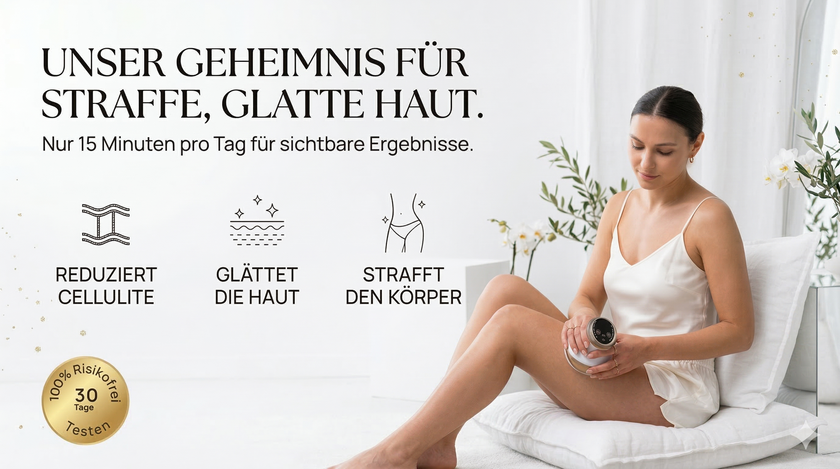 Lehnen Sie sich zurück, machen Sie es sich bequem und verwöhnen Sie Ihre Haut mit der Celluviaa-Behandlung. Straffen Sie Ihre Haut, reduzieren Sie das Erscheinungsbild von Cellulite und lösen Sie Verspannungen mit nur wenigen Minuten pro Tag.
